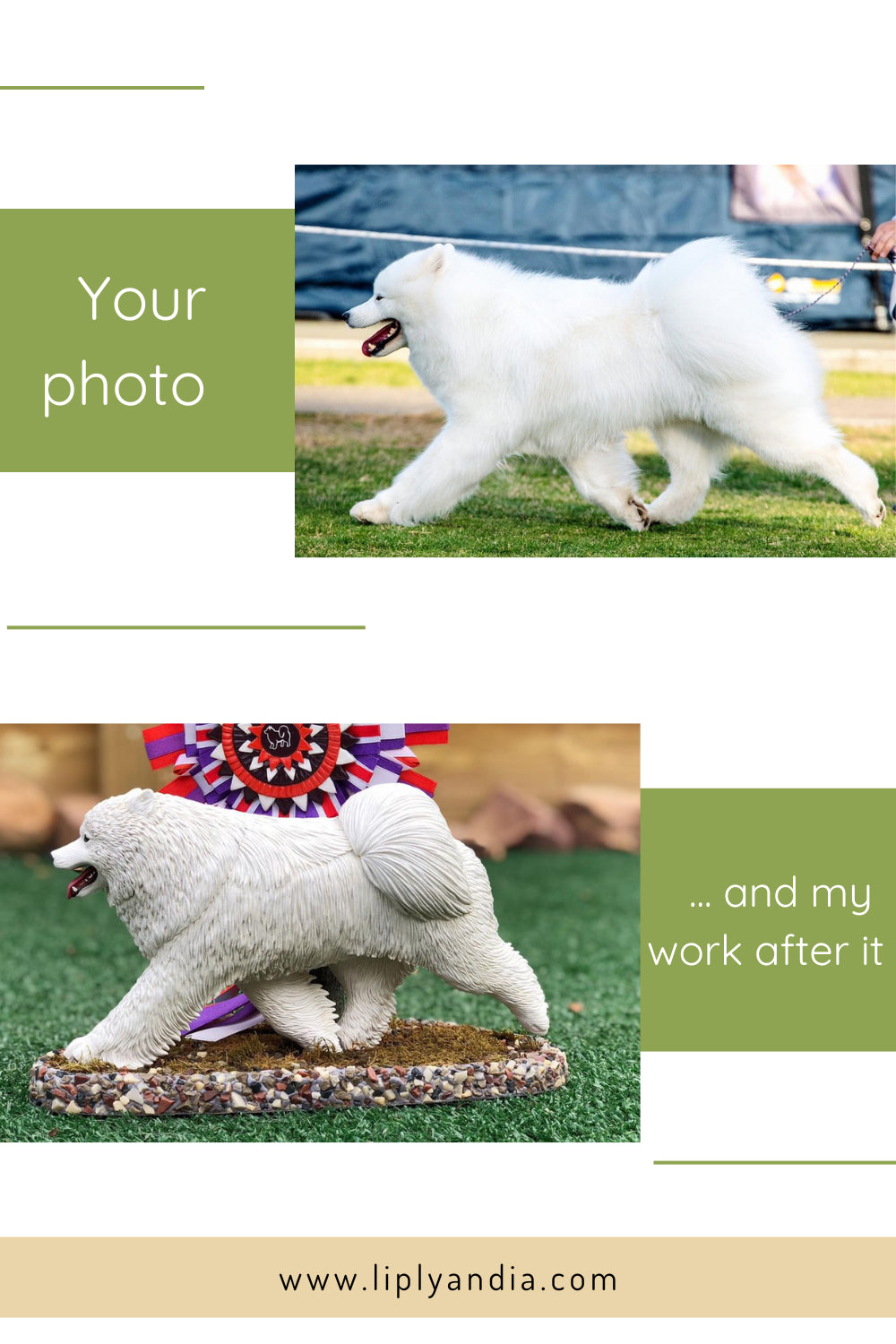 This handcrafted sculpture is created exclusively to order based on client-provided photos. Every detail is carefully sculpted and hand-painted to reflect the unique features and personality of the Samoyed.